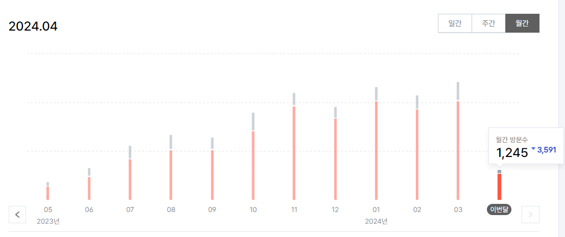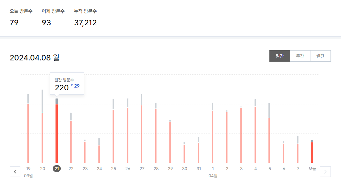가감없이 공개하는 저의 방문 통계입니다. 기이하게도? 평일엔 방문자수 200+a, 주말엔 100명 미만대를 유지하고 있습니다. 주간 방문자는 1100명대이며 월간은 꾸준히 늘어나고 있는 모습입니다.